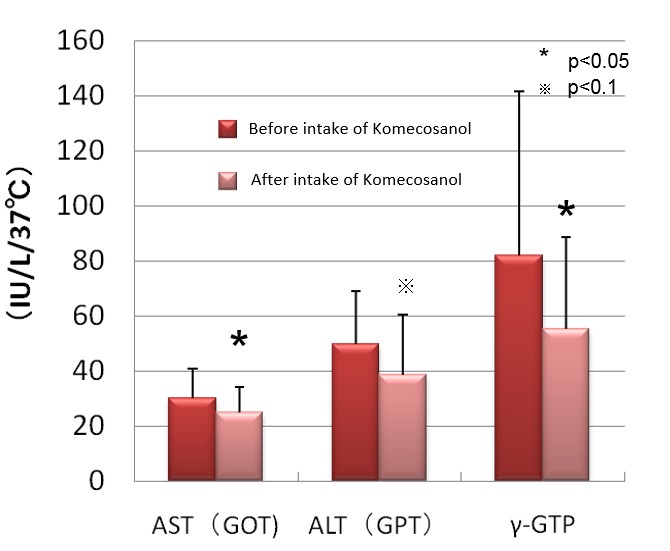 12 subjects were given 33mg/day of Komecosanol™ for six weeks. The results showed a significant decrease in γ-GTP, AST and ALT, indicators of alcoholic liver diseases.